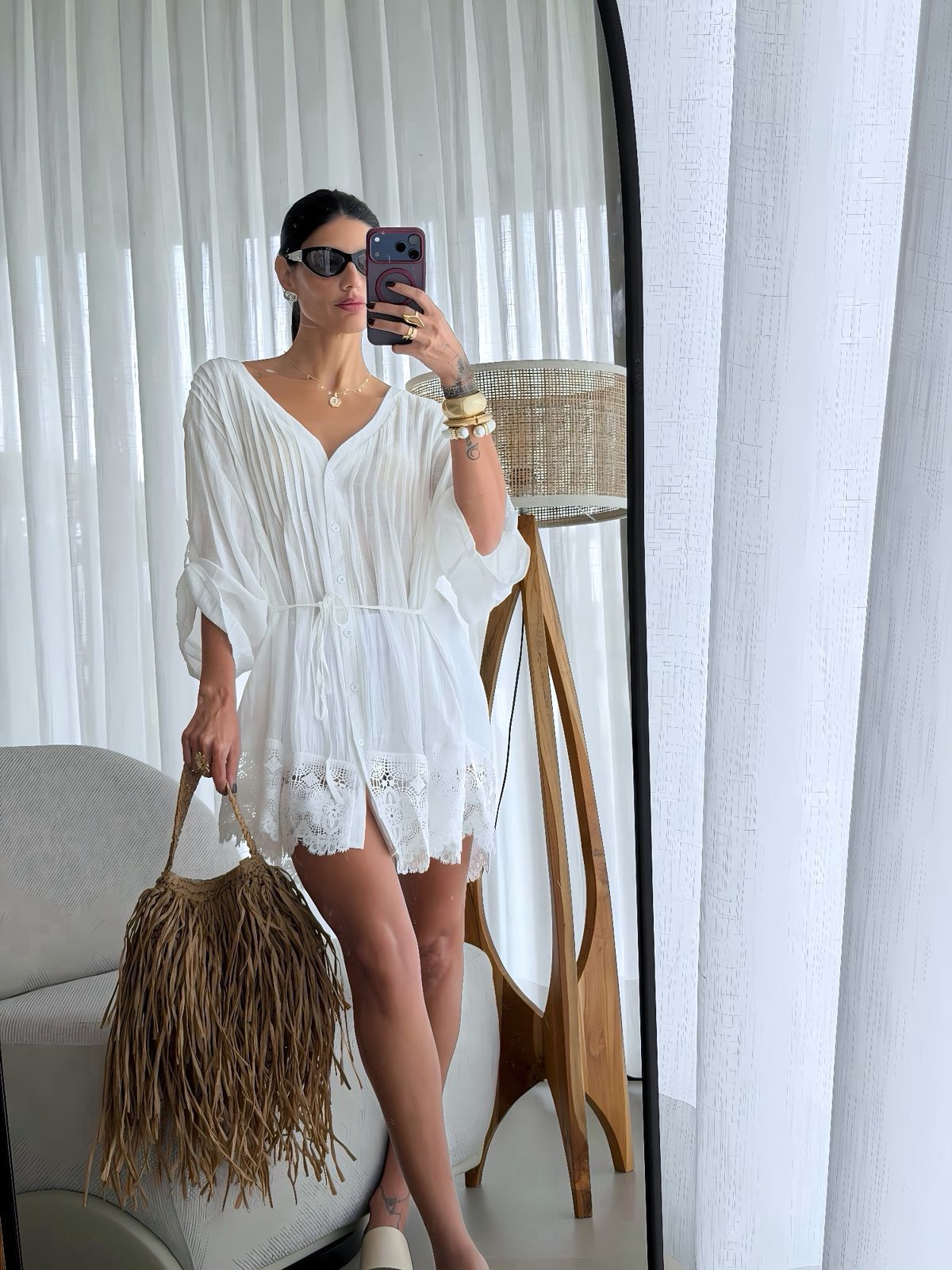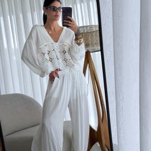 Bata em Cambraia Algodão com renda, manga 7/8, com amarração na cinta e fechamento por botões.