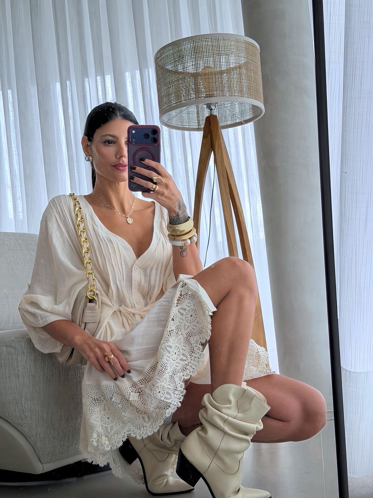 Bata em Cambraia Algodão com renda, manga 7/8, com amarração na cinta e fechamento por botões.