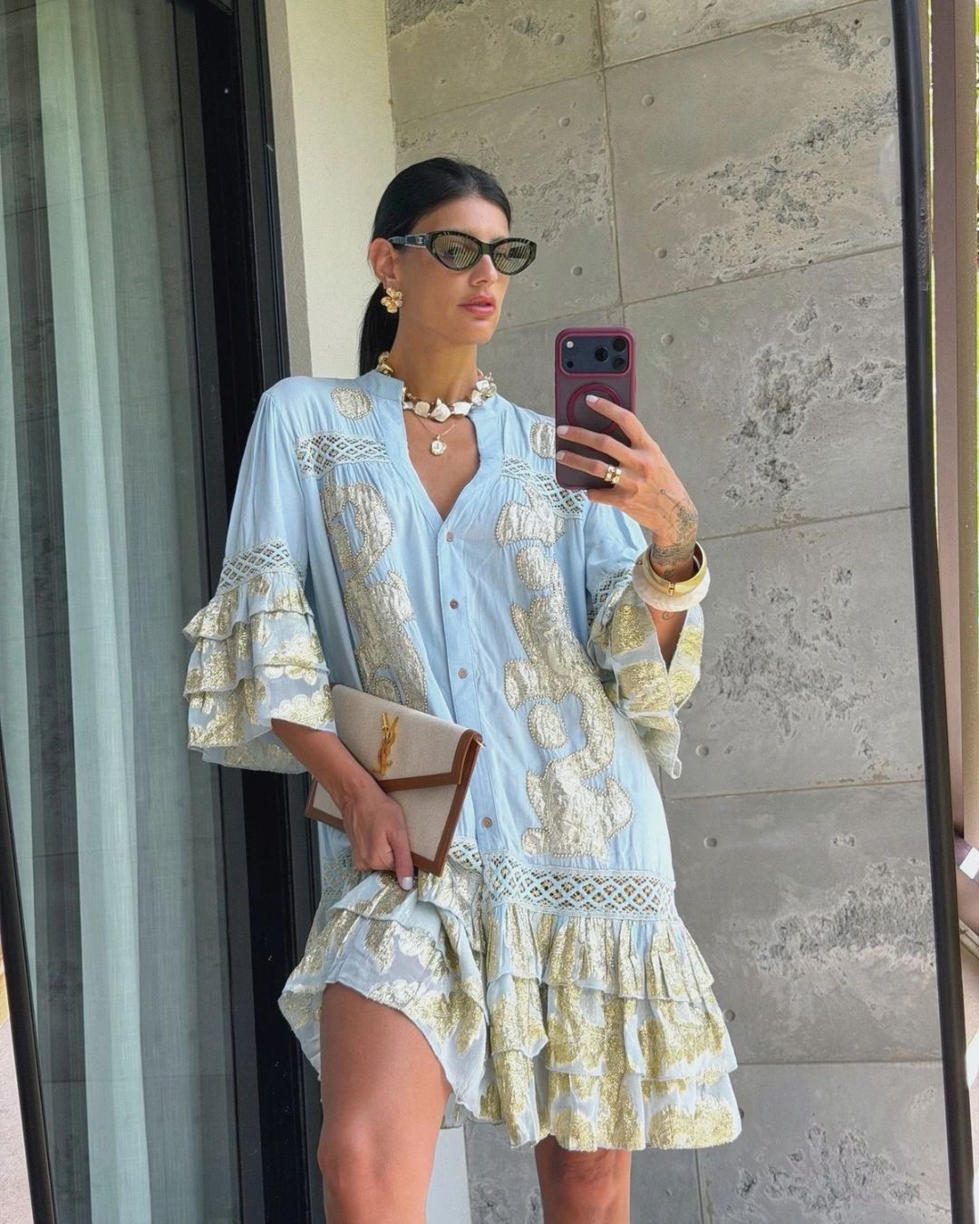 Bata em algodão com lurex, manga 7/8, fechamento por botões e babados.