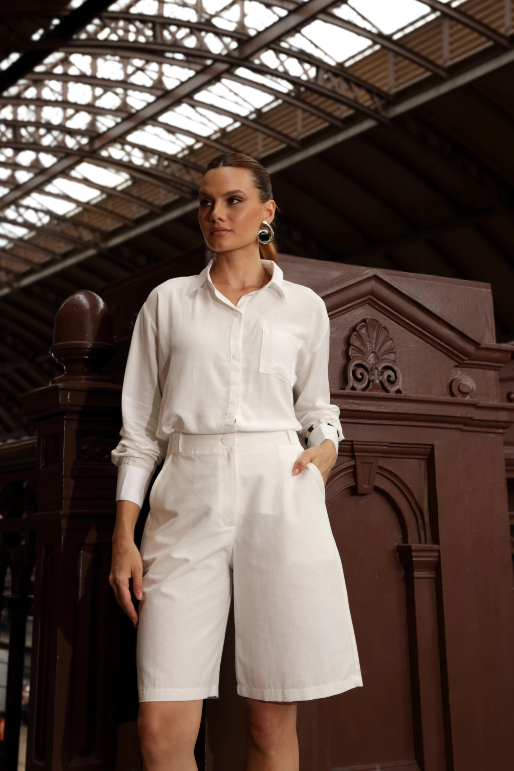 Bermuda em linho, com passando, bolso frontal e fechamento por botão e zíper.