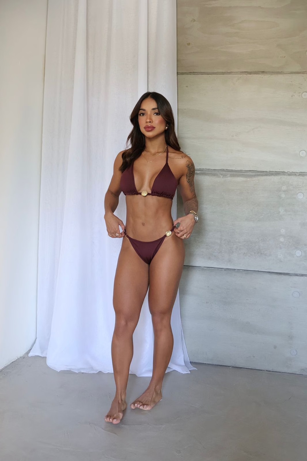 Calcinha com laterais regulavéis e aviamento dourado em formato de concha.