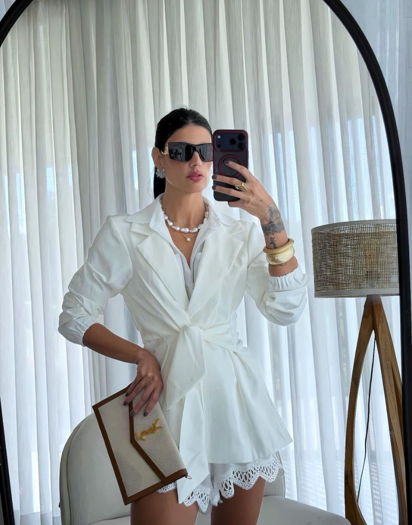 Blazer em Alfaiataria Sensoriale, manga longa com elastaico no cós e amarração.