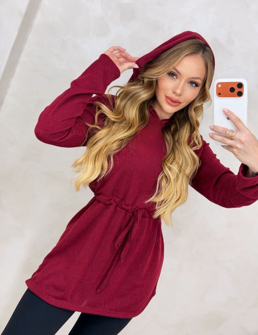 Blusa em lanzinha, comprimento alongada, com capuz, manga longa e ajuste na cintura.