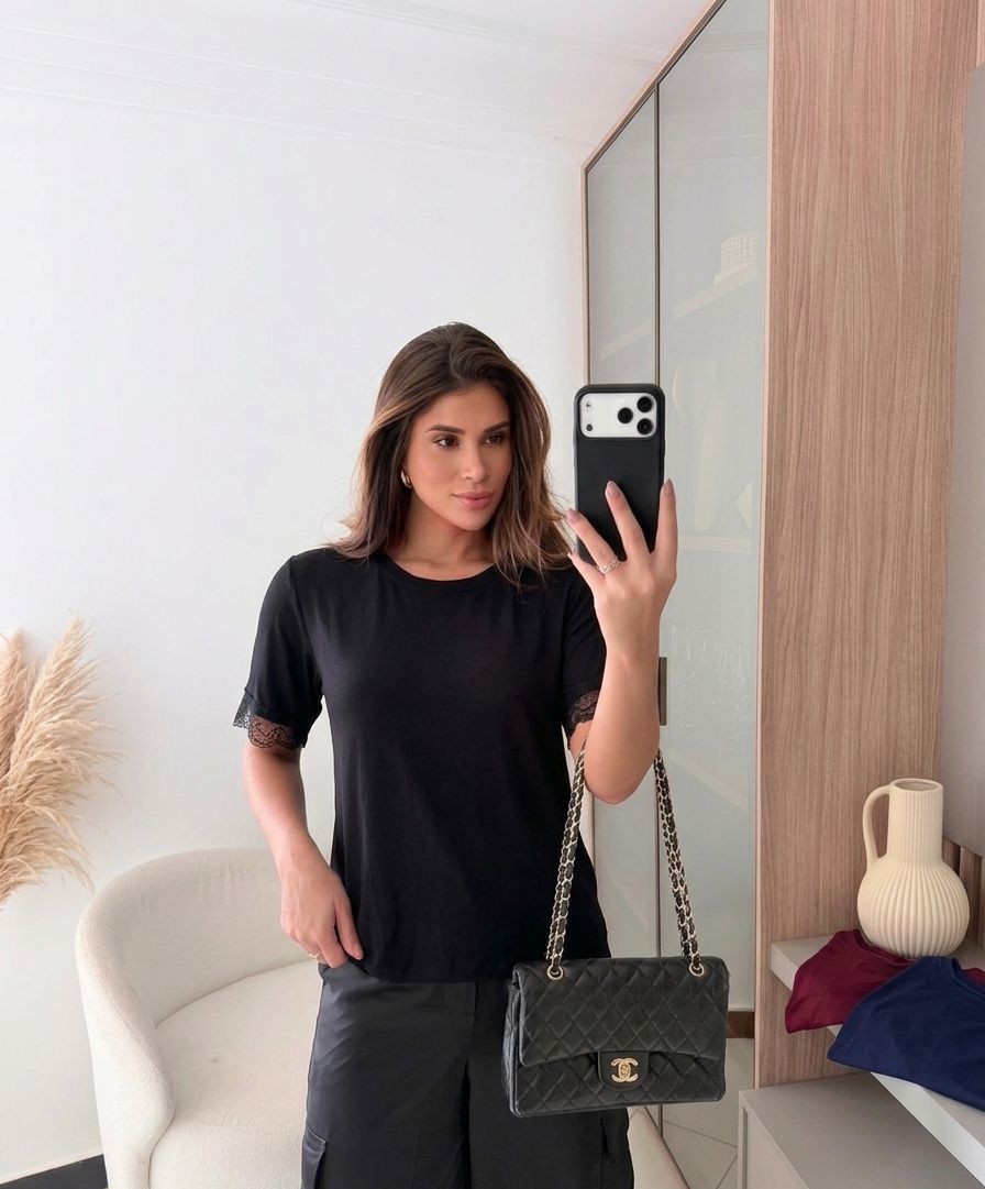 Blusa em viscolycra com renda, manga curta e decote redondo.