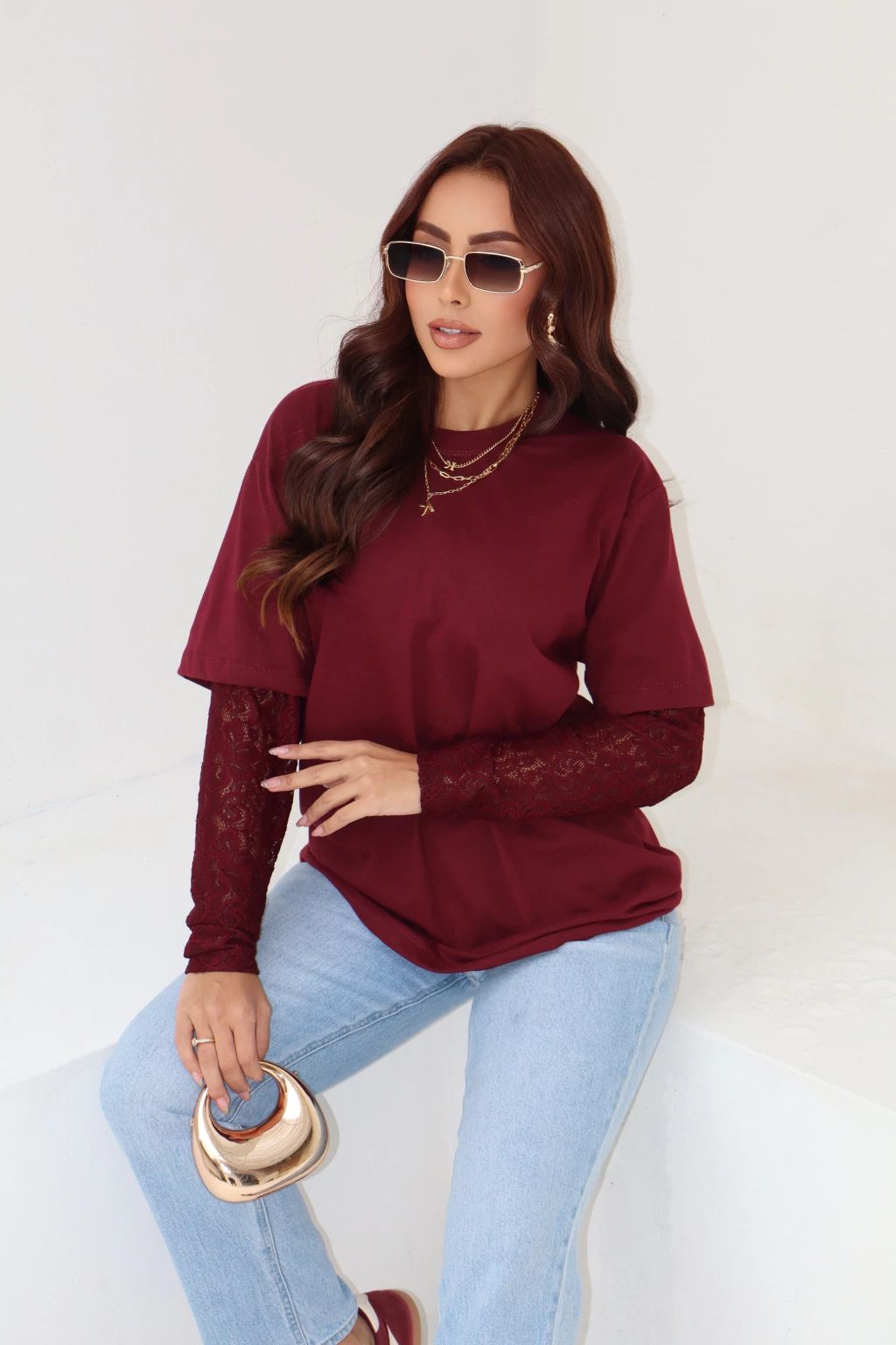 T-shirt em algodão com mangas em renda.