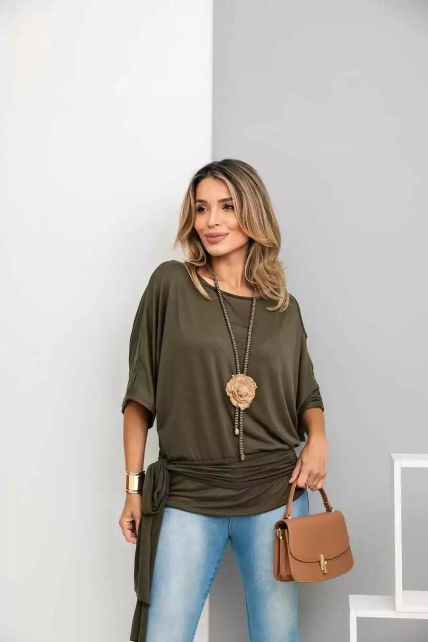 Blusa em viscolycra, manga 3/4 com abertura e amarração na cintura.