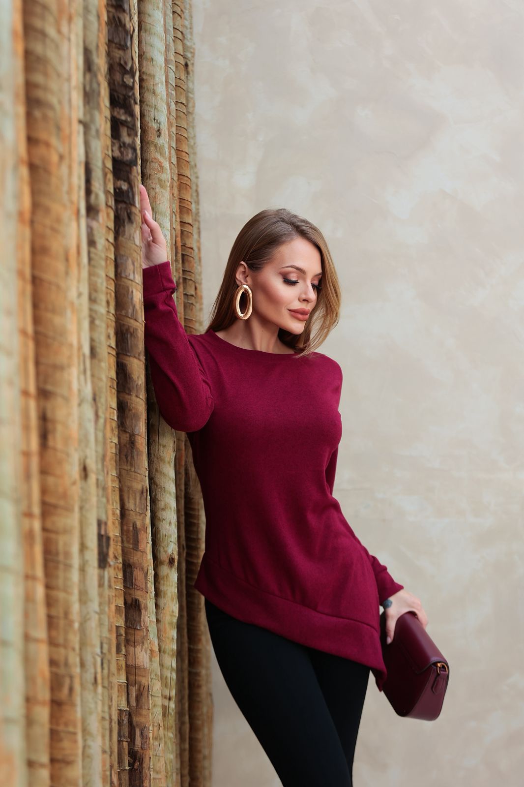 Blusa em lãzinha, modelagem assimétrica, manga longa e fenda lateral.