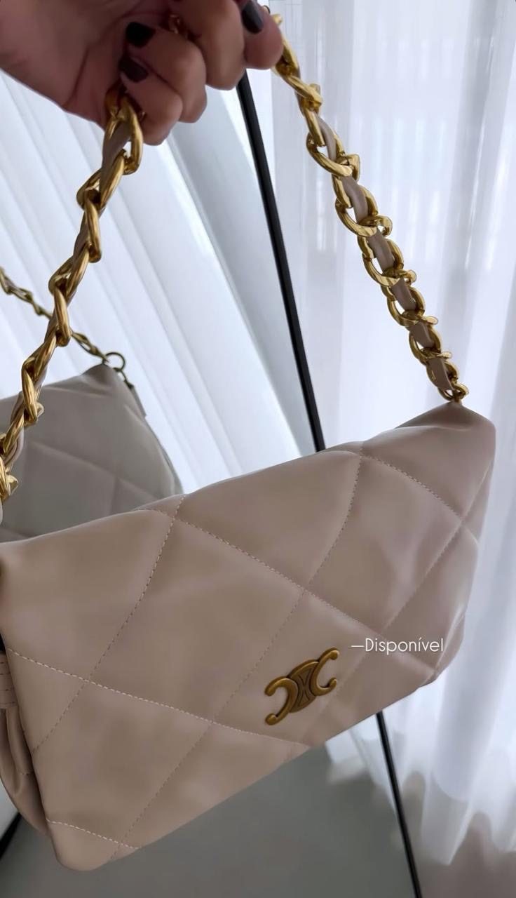 Bolsa em couro sintético forrada, retangular, alça de corrente e fechamento magnético