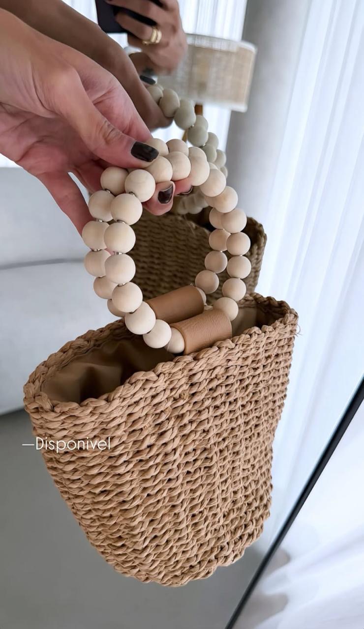 Bolsa em palha forrada, estruturada e alça em esferas de madeira.