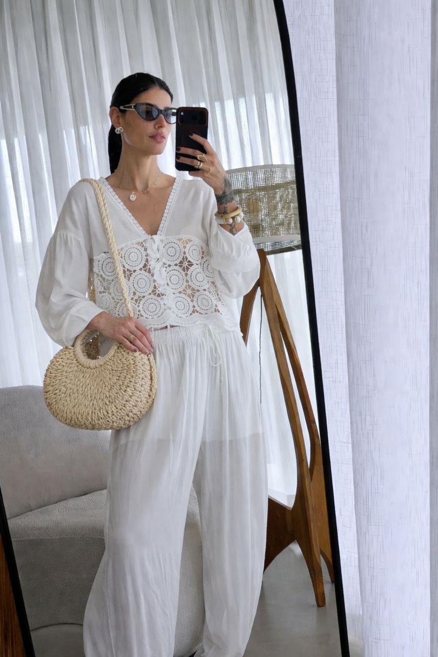 Bolsa em palha forrada, estruturada, com alça removível e fechamento por cordão.
