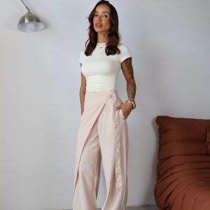 Calça pantalona em Alfaiataria Marrant, com bolso fontal, sobreposição com ajuste lateral e fechemento por botão e zíper.