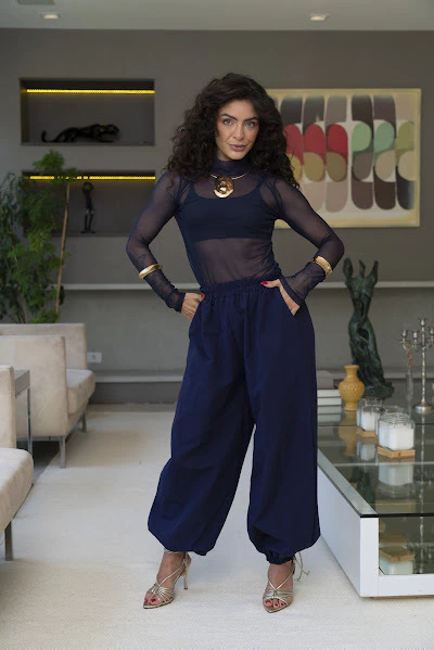 Calça modelo aladin em Alfaiataria Marrant, com bolso frontal, elastico na barra e na cintura.