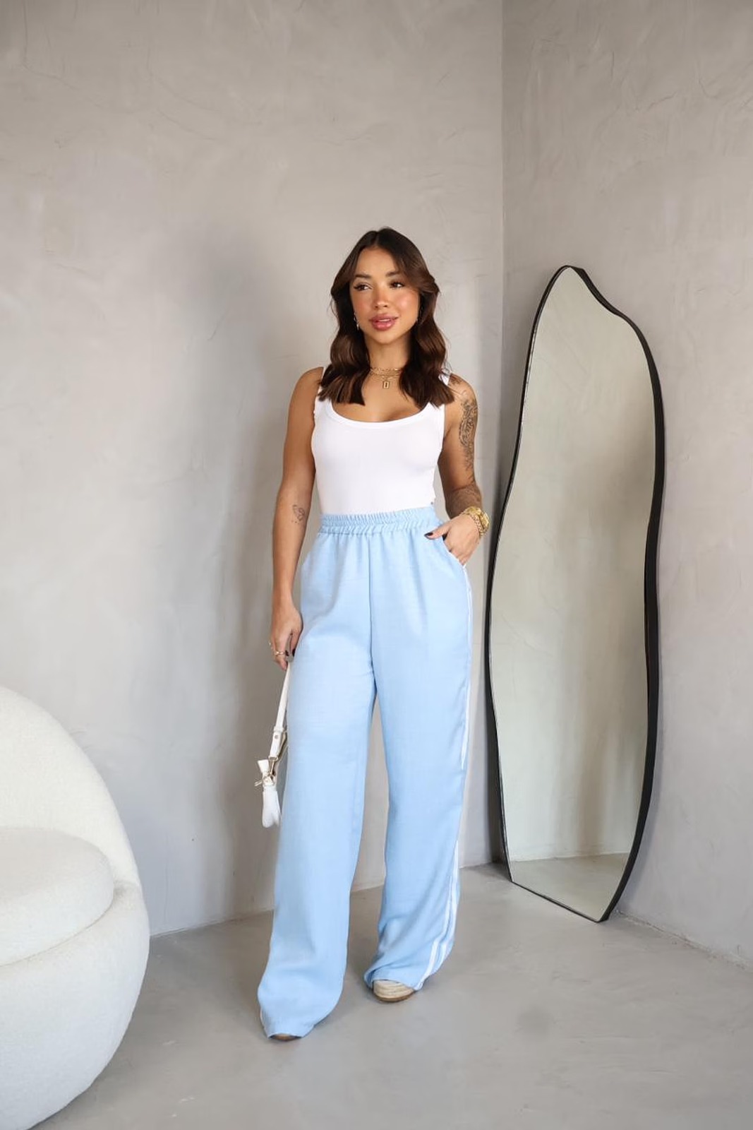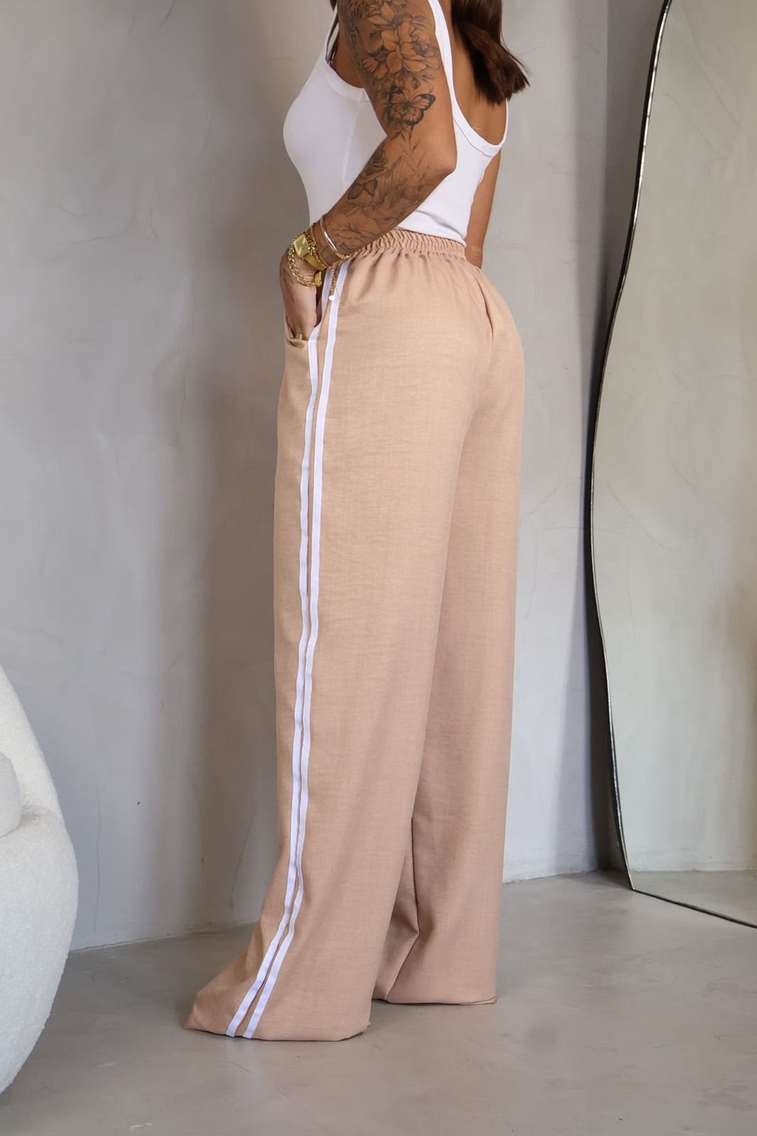 Calça wide leg em alfaiataria marrant, com listras laterias, bolso frontal e elastico na cintura.