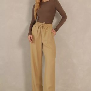 Calça em alfaiataria, com bolso frontal e elastico na cintura com amarração.