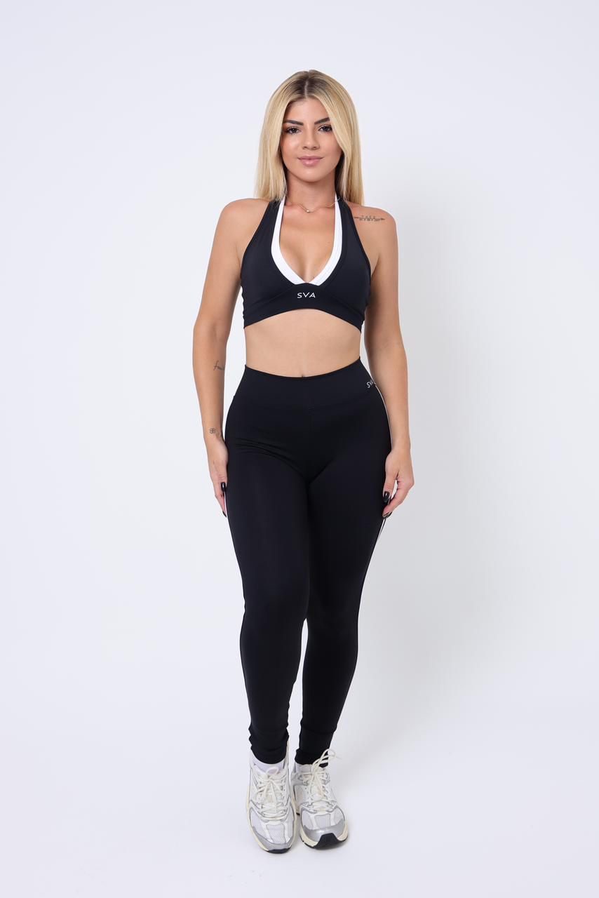 Calça em poliamida em elastano, cintura alta e viés contrastante na lateral da perna.