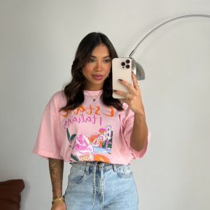 Camiseta over em algodão, manga curta com estampa e detalhe de strass.