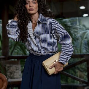 Camisa em Alfaiataria, manga longa, com bolso frontal e fechamento por botões.