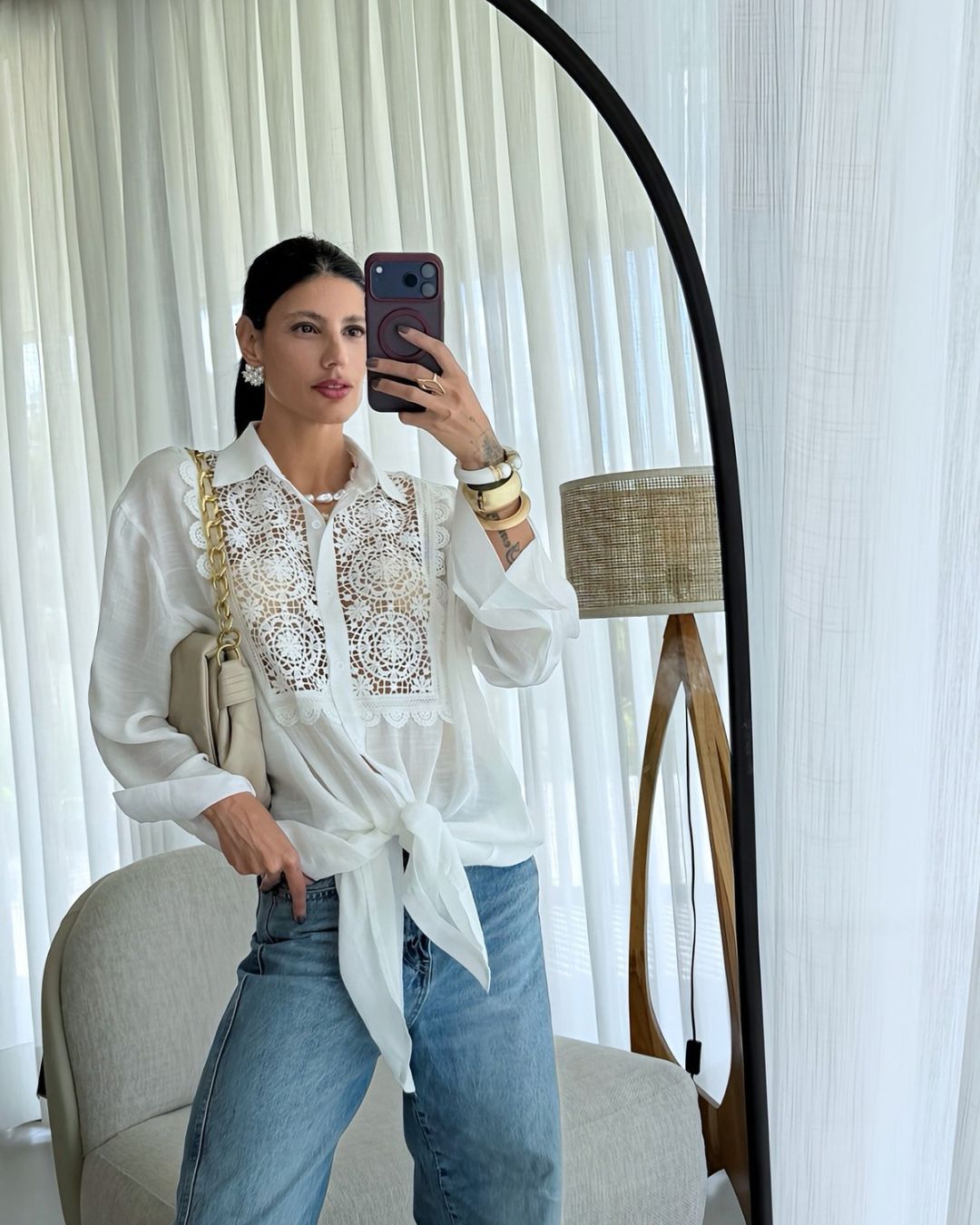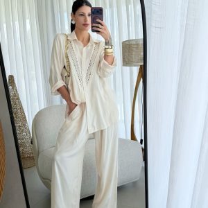 Camisa em algodão e renda, manga longa e fechamento por botões.