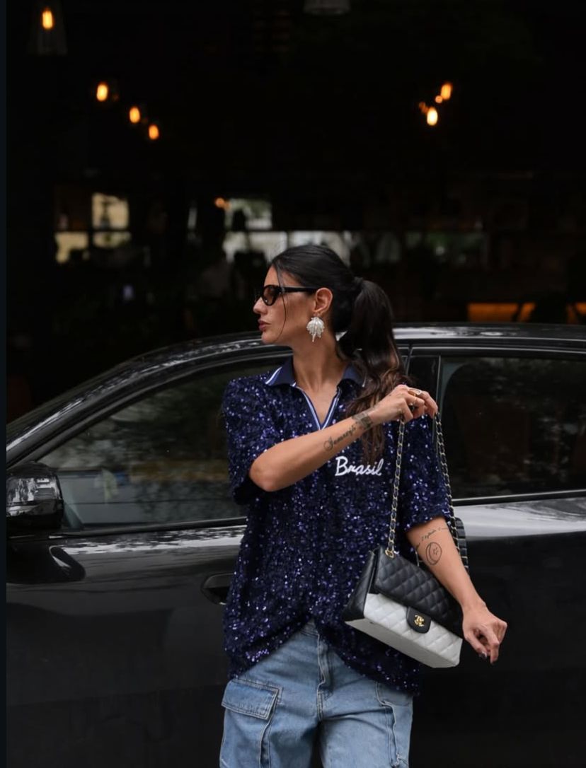 Camisa alongada, gola polo e decote V, com bordado escrito Brasil.