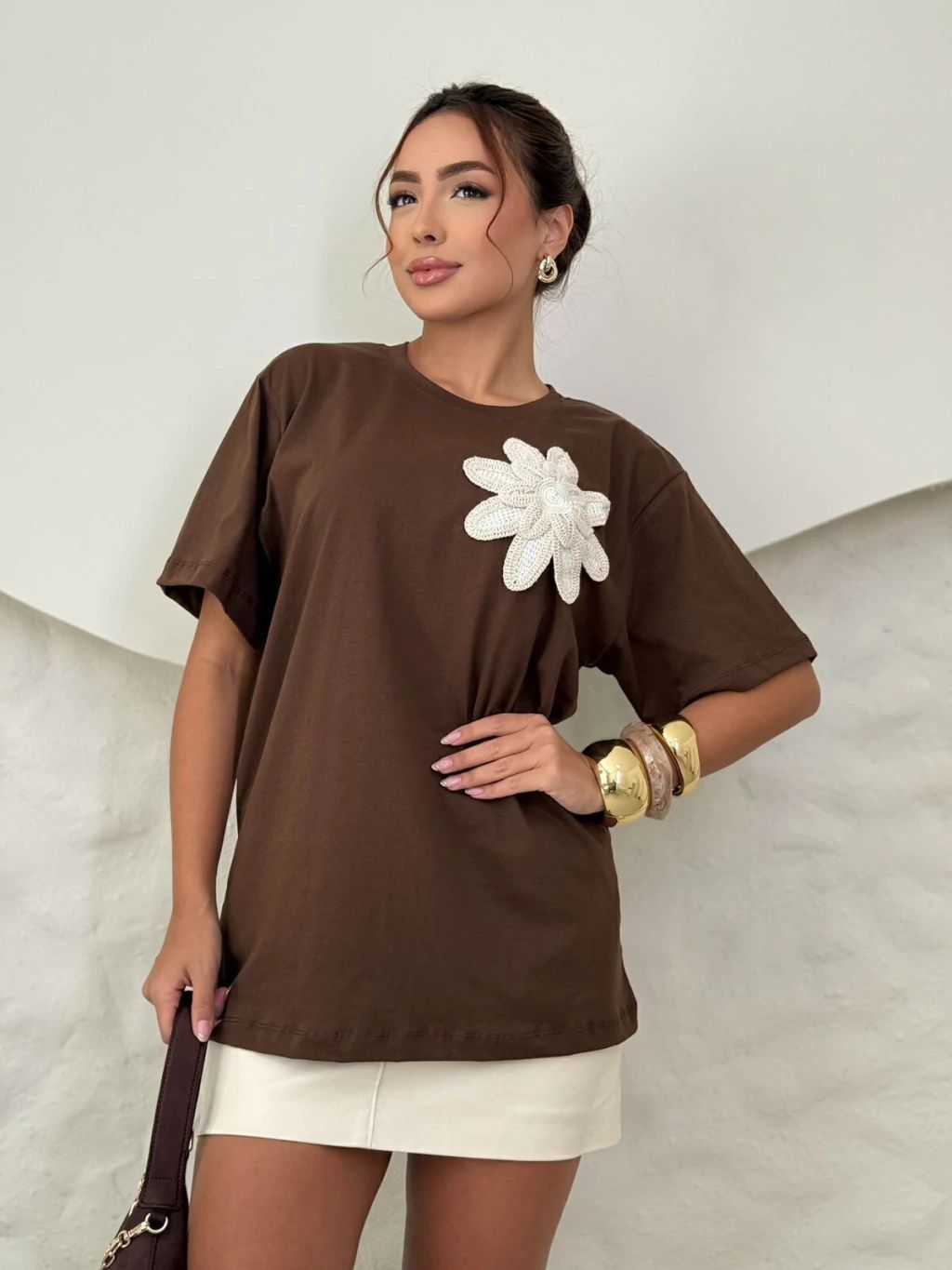 Camiseta over em algodão, manga curta com aplique de crochê.