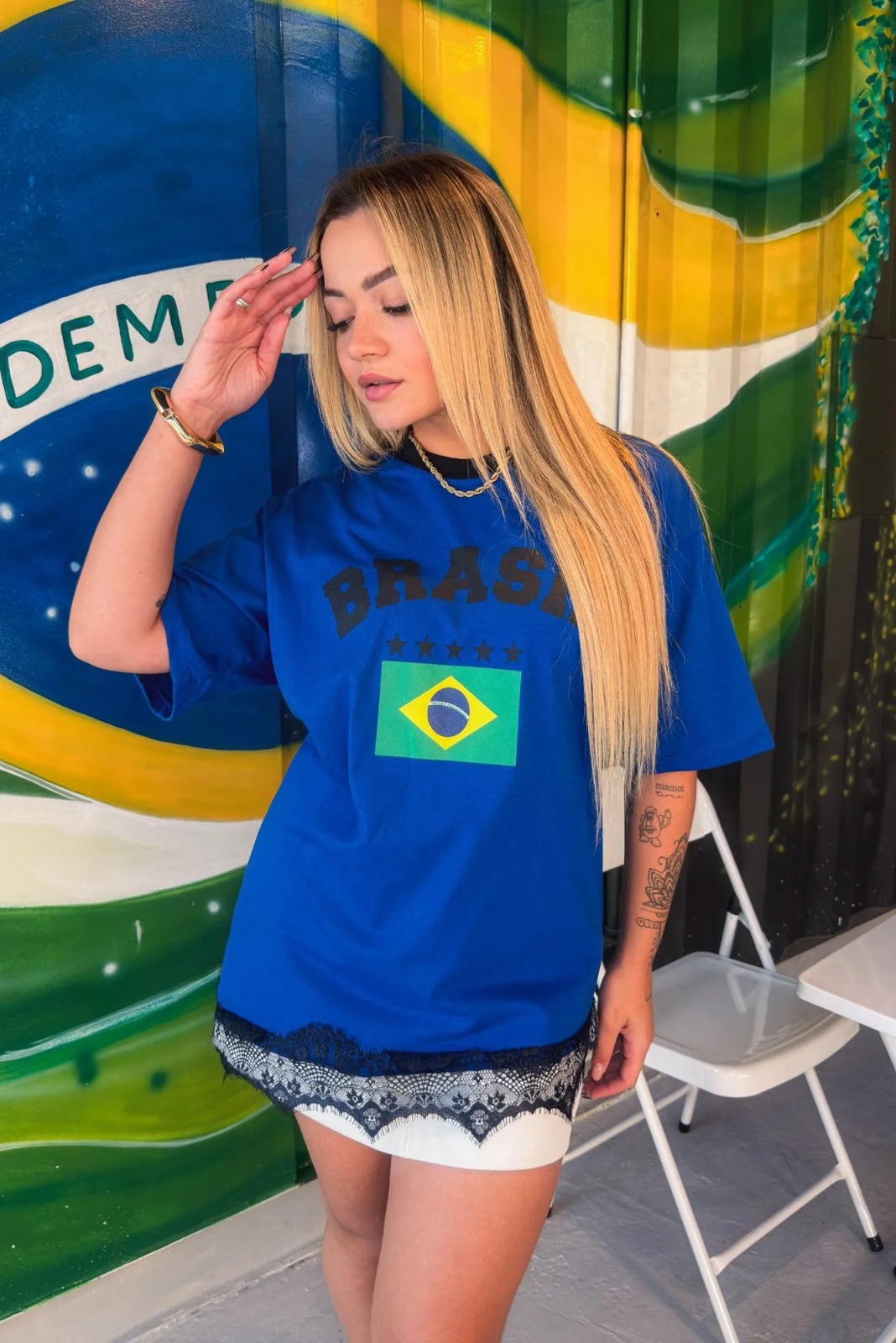 Camiseta em algodão, manga curta com estampa e renda na barra.
