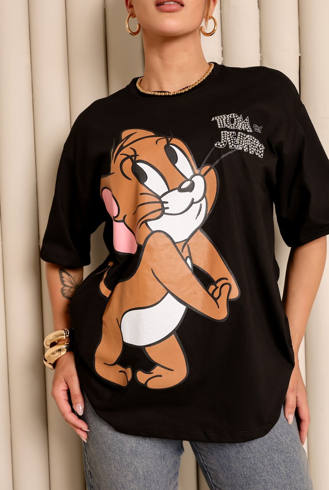 Camiseta over em algodão, manga curta com estampa e pedraria.