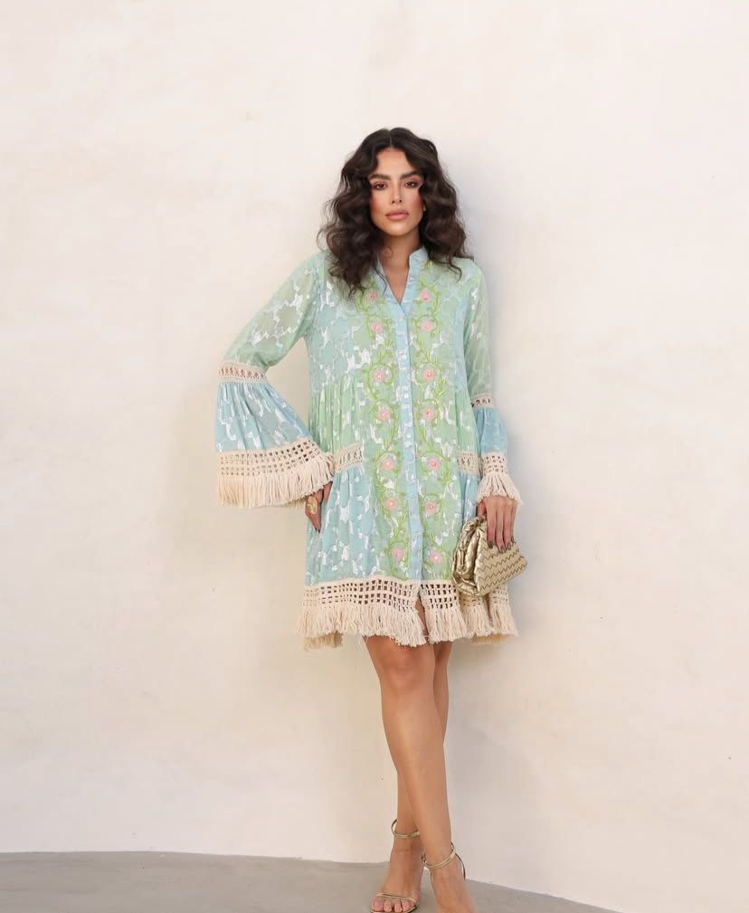 Chemise em algodão, bordada a mão, com franjas e fechamento por botão.