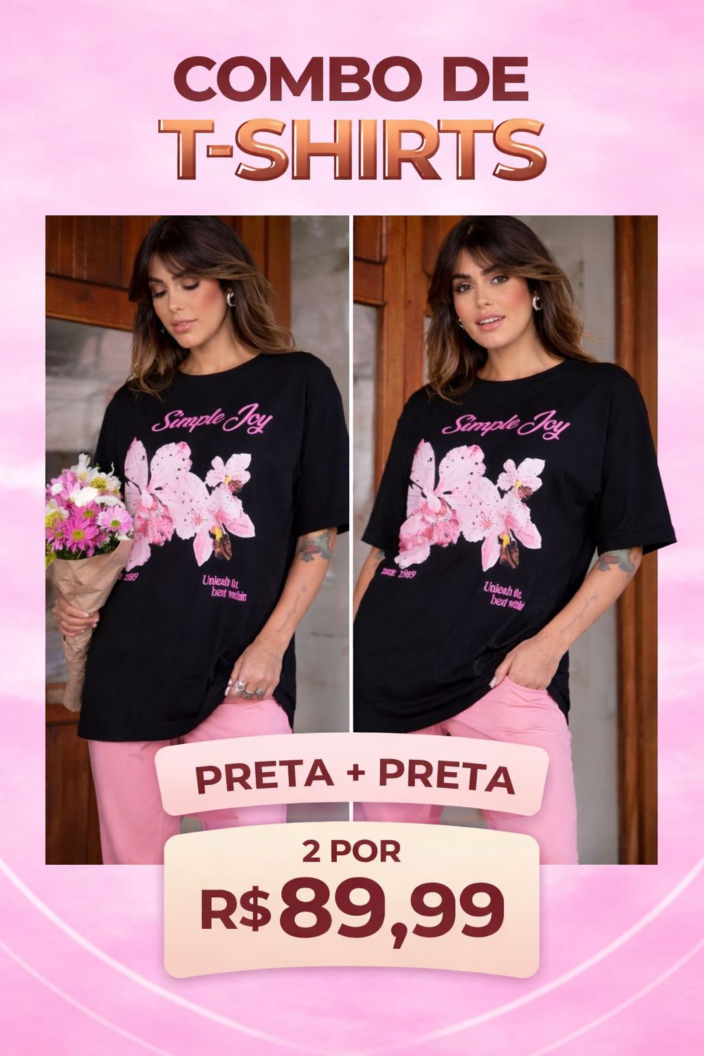 Combo Camisetão em Algodão, manga curta, gola redonda e estampa frontal.