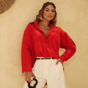 Conjunto em anarruga. Blusa ampla, assimétrica com gola e manga japonesa. Calça wide leg com elástico no cós.