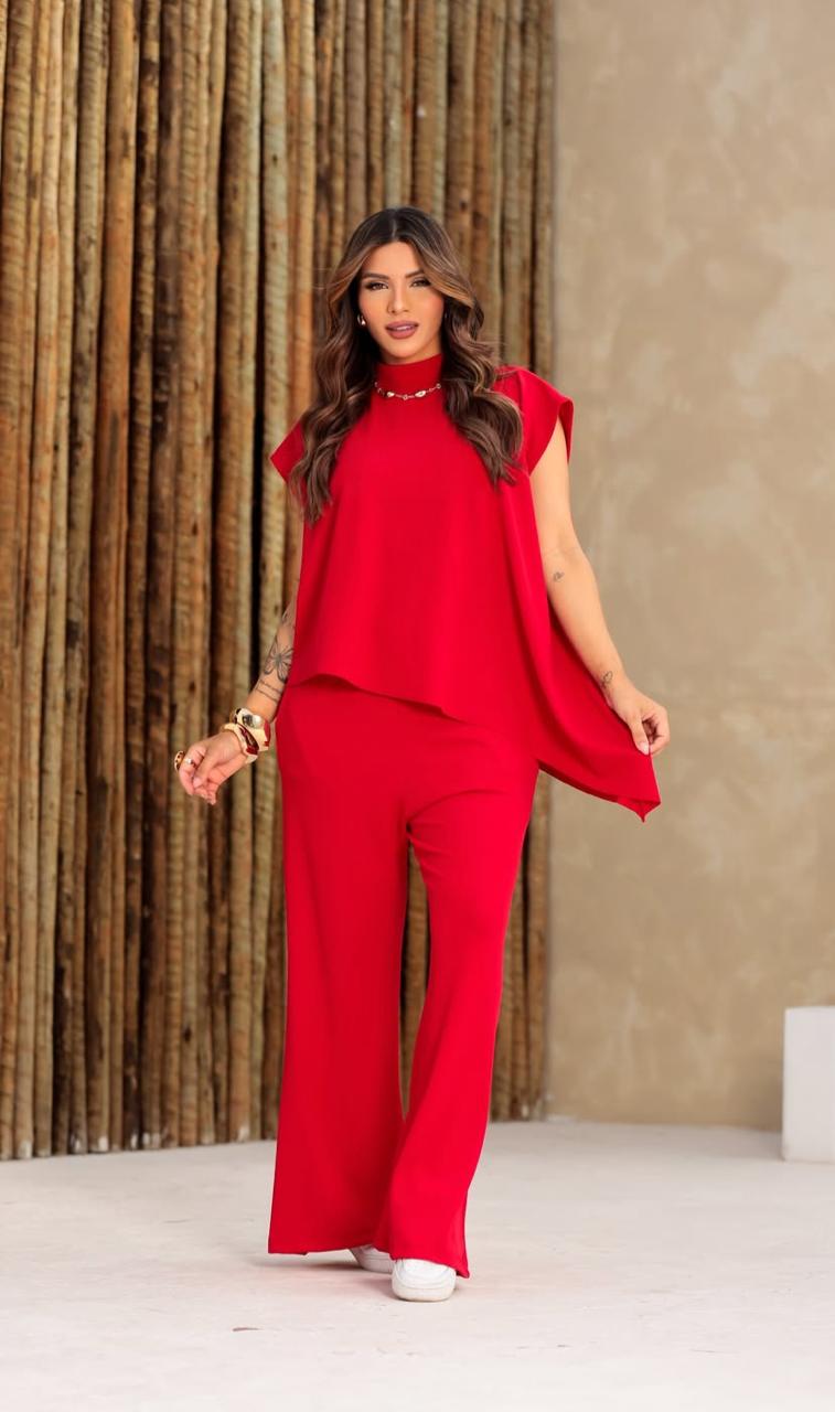Conjunto em anarruga. Blusa ampla, assimétrica com gola e manga japonesa. Calça wide leg com elástico no cós.