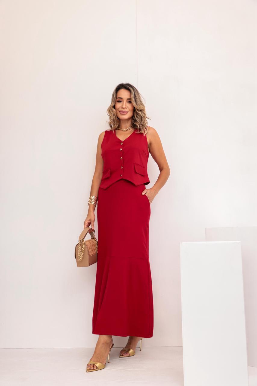 Saia estilo sereia, elástico na cintura, bolso frente e fenda frente.