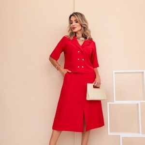 Conjunto em alfaitaria marrant Blusa manga 3/4 com fechamento por botões Saia mídi com bolsos e elástico no cós.