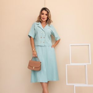 Conjunto em alfaitaria marrant Blusa manga 3/4 com fechamento por botões Saia mídi com bolsos e elástico no cós.