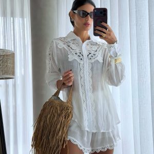 Camisa alongada com renda, manga longa e fechamento por botões.