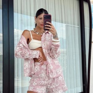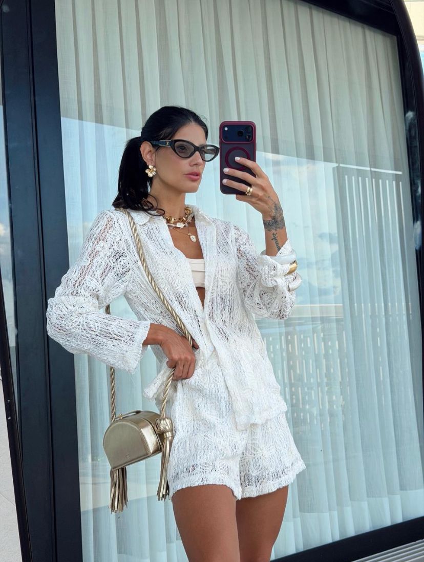 Conjunto em tricô forrado com bordados. Camisa manga longa com fechamento por botões. Short forrado com elástico no cós e amarração.