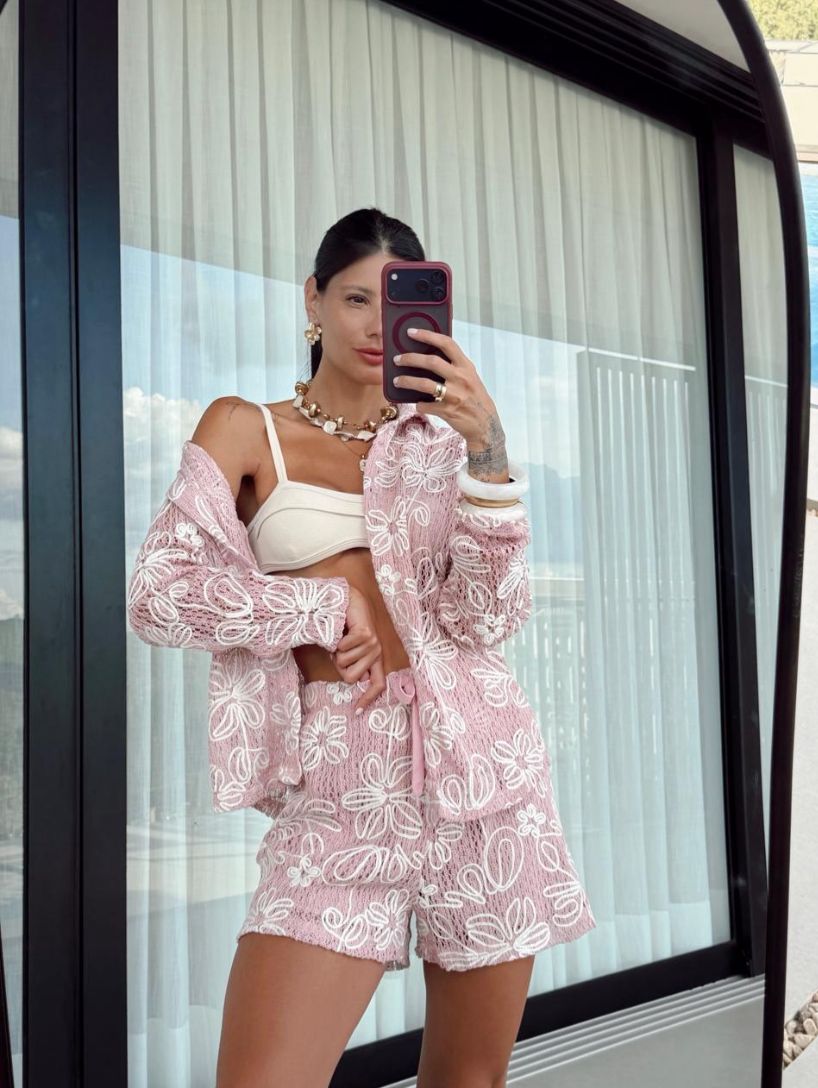 Conjunto em tricô forrado com bordados. Camisa manga longa com fechamento por botões. Short forrado com elástico no cós e amarração.
