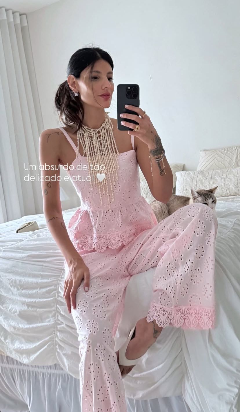 Calça forrada com fechamento por zíper e botão com barra em renda.