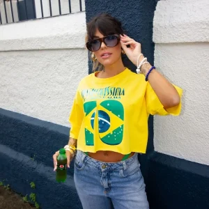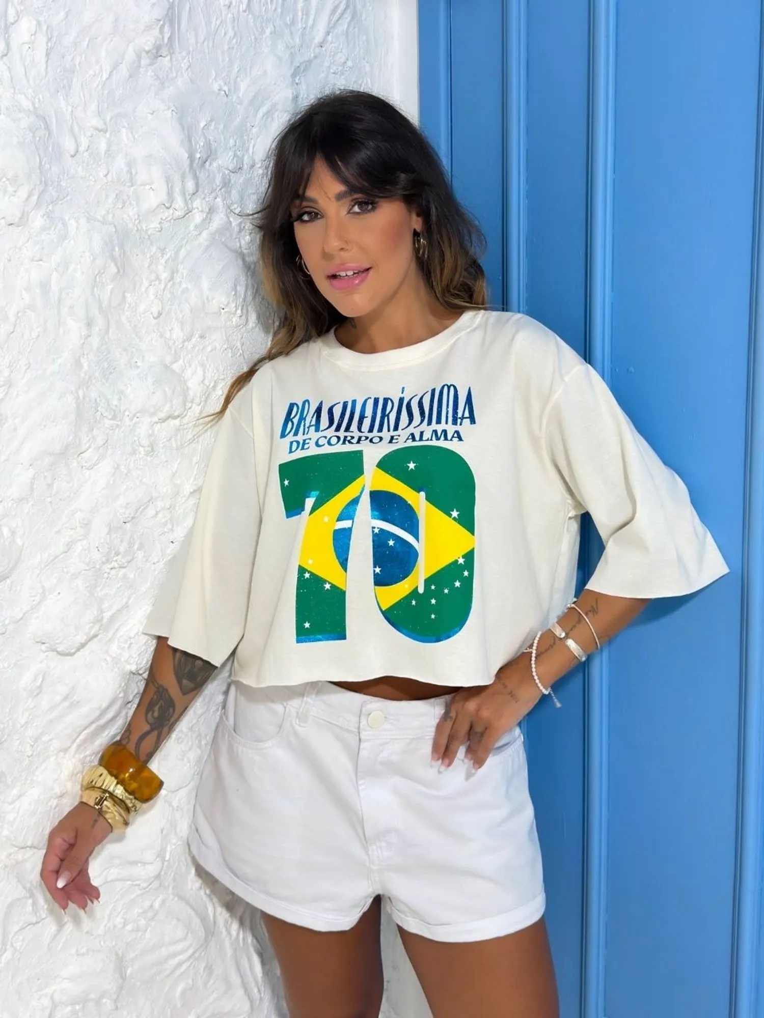 T-shirt Cropped em Algodão, manga curta e estampa.