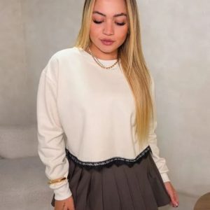 Cropped em algodão com renda, manga curta e gola redonda.