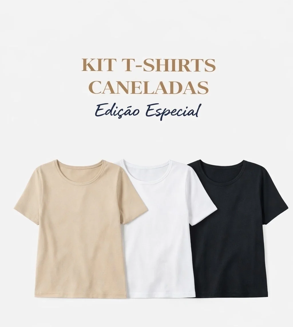 Kit com 3 T-shirt canelada, manga curta e gola redonda.