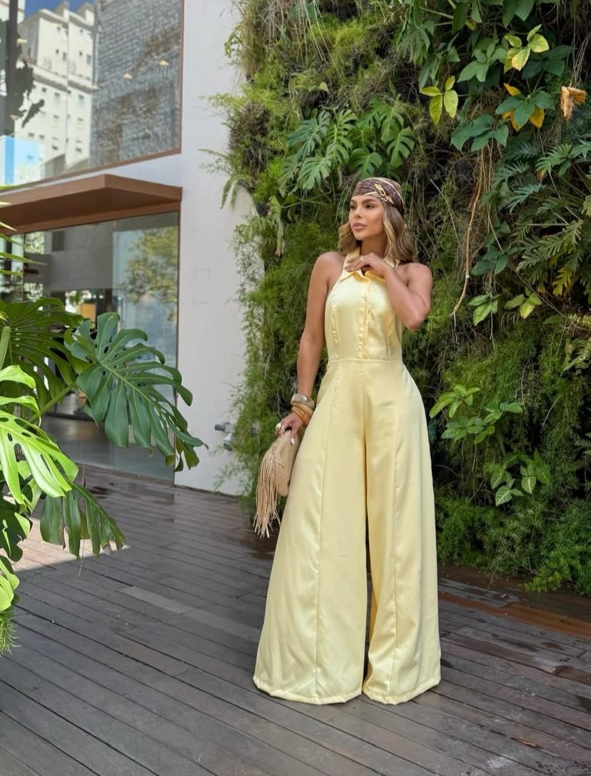 Macacão em alfaiataria marrant, modelo pantalona, com botões decorativo, frente única com amarração no pescoço , gola de camisa e elástico nas costas.