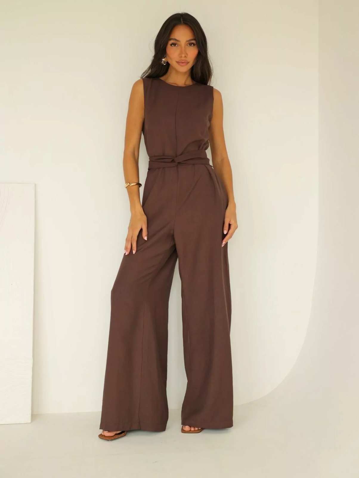 Macacão em Alfaiataria, modelo pantalona, com bolso frontal, fechamento traseiro por zíper e faixa ajustável na cintura.