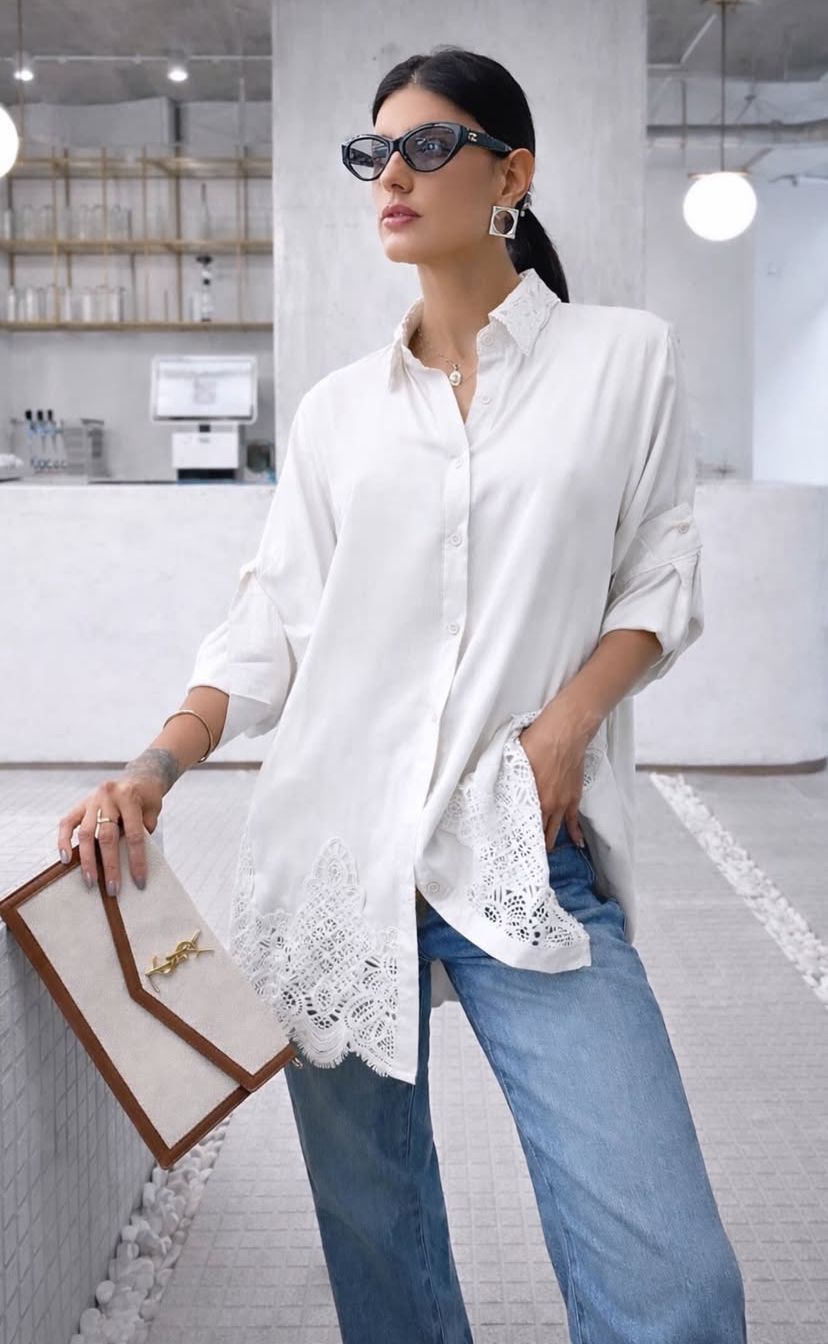 Maxi camisa em algodão com renda, manga longa, fechamento por botões e renda na barra.