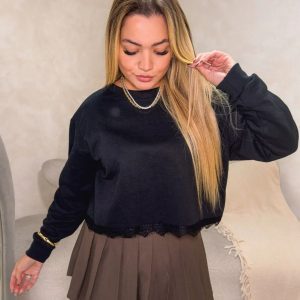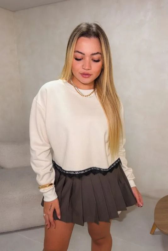 Cropped em moletom com renda, manga longa com punho e renda na barra.
