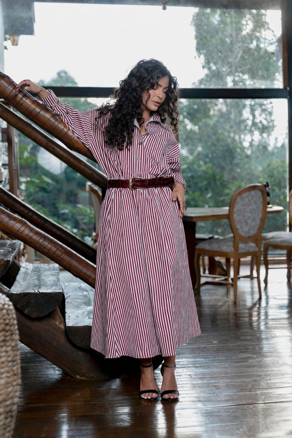 Saia midi em linho, com bolso frontal e elástico na cintura.