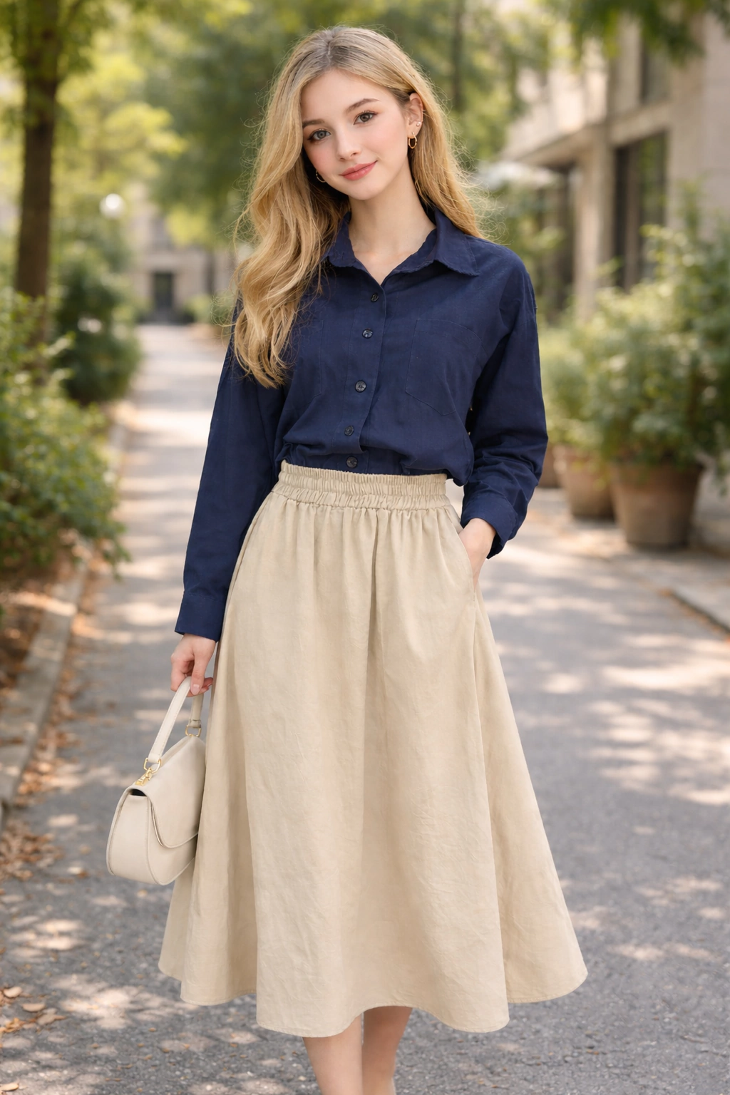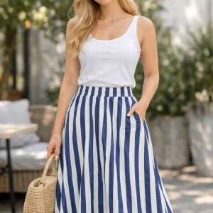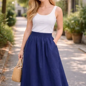 Saia midi em linho, com bolso frontal e elástico na cintura.