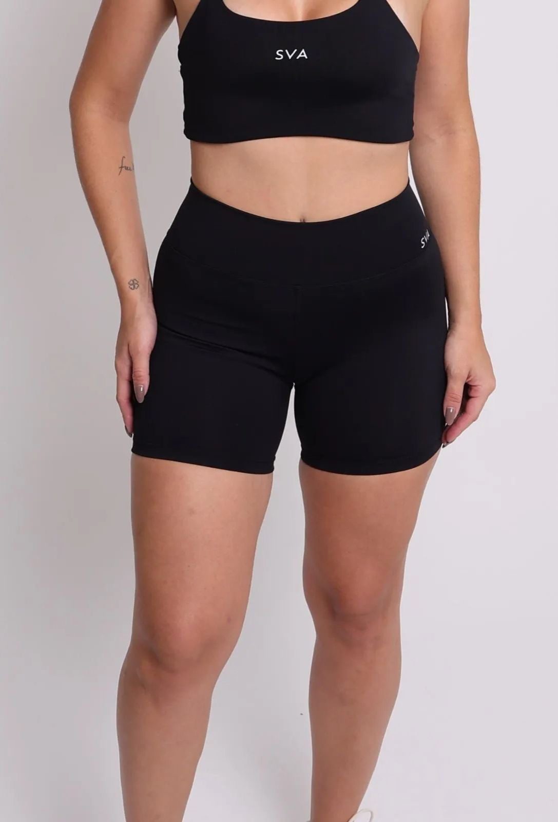 Short em poliamida com elastano, modelo biker, costura do cós nas costas em V.