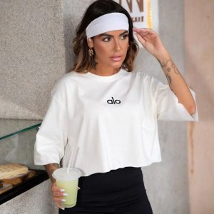 T-shirt Cropped em Algodão, manga curta e estampa bordada.
