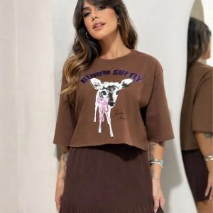 T-shirt Cropped em Algodão, manga curta e estampa.