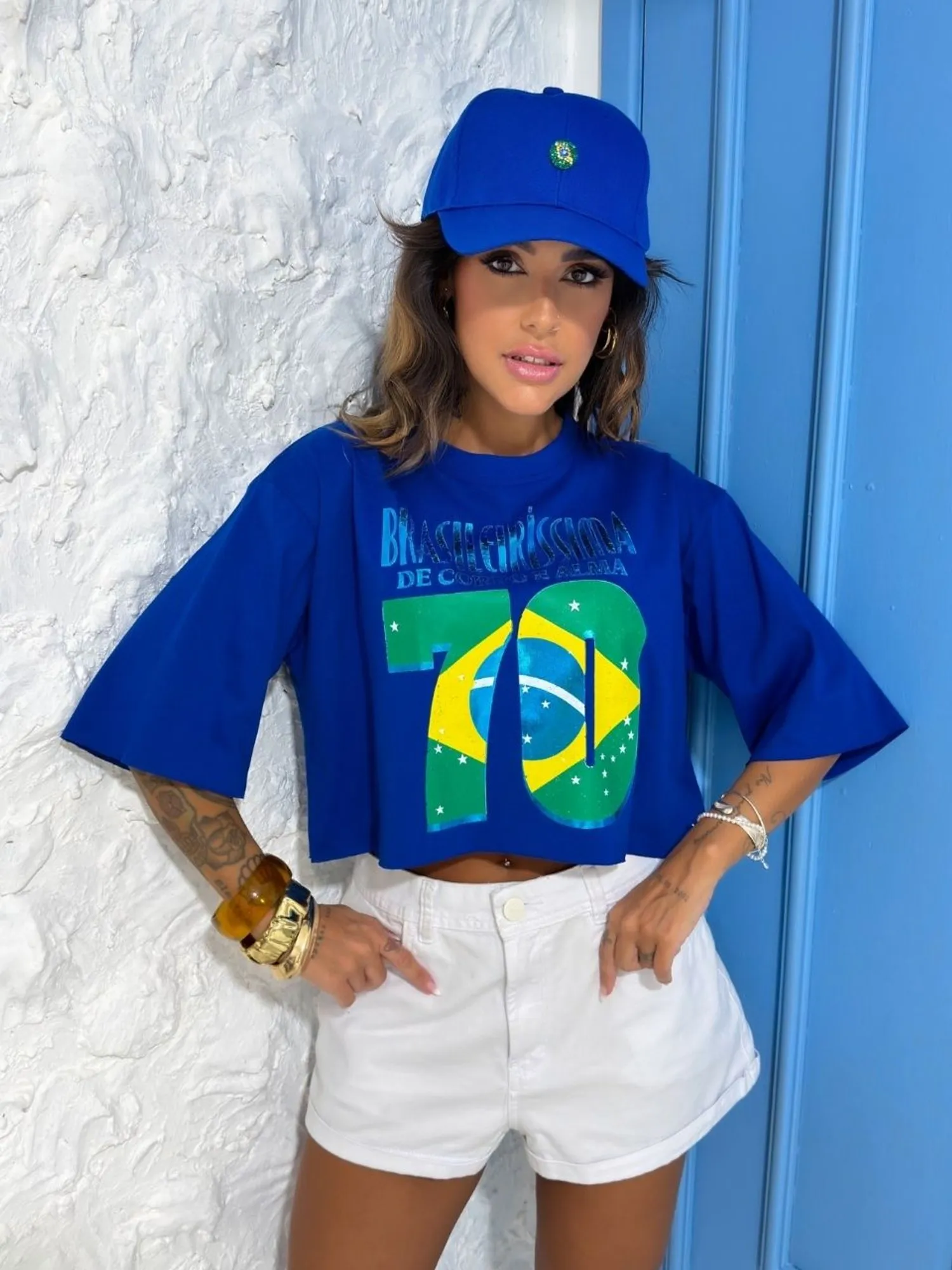 T-shirt Cropped em Algodão, manga curta e estampa.